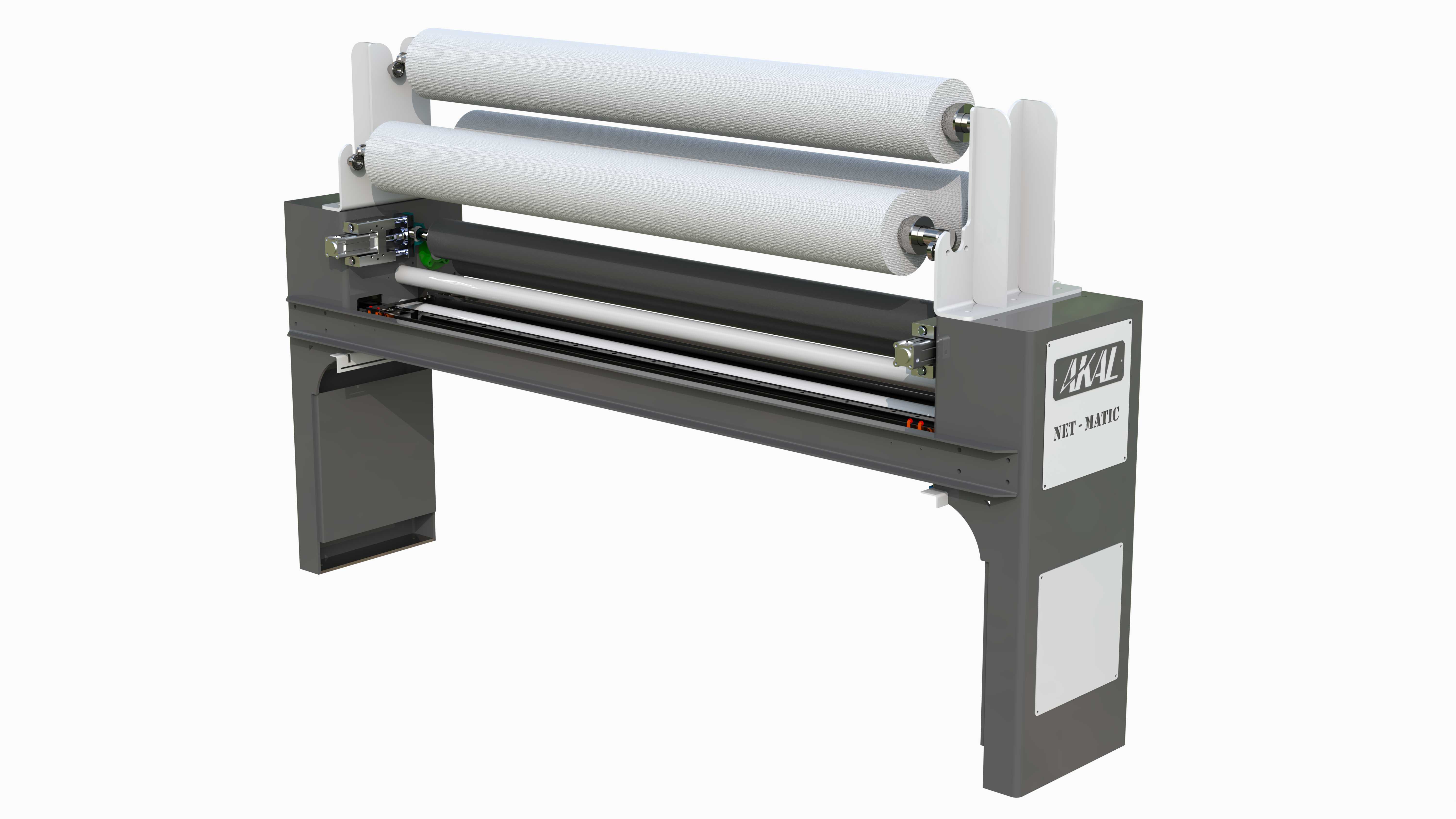 - Um desses eixos é motorizado e desenrola os rolos de malha de fibra de vidro.